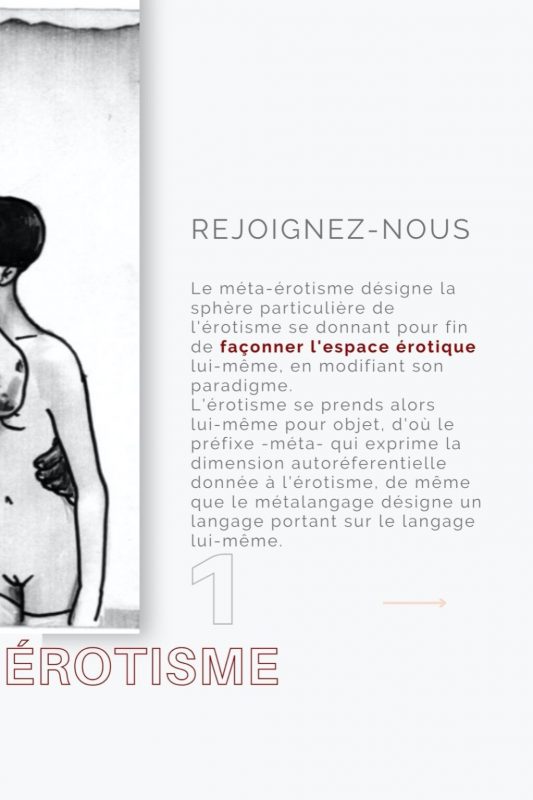 “Partant généralement du constat d’un espace érotique fermé, le méta-érotisme cherche ainsi à promouvoir l’érotisme comme proposition d’expression et de réalisation sociale ou artistique auxquelles la matrice implicite de la société fait jusqu’alors obstacle. Ainsi, là où l’action simplement réside dans une lutte pour la mise en œuvre de plaisirs, l’action méta-érotique réside dans une lutte pour la diffusion de l’érotisme dans le quotidien, la vie de tous les jours et à terme, la victoire sur l’ennui, la banalité et tout ce qui contrarie l’accès aux plaisirs terrestres.”