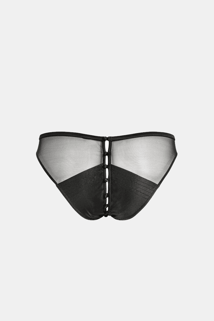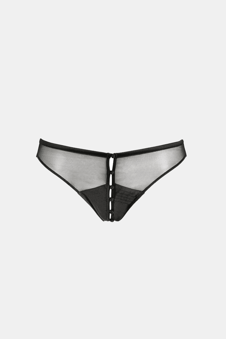 Cette culotte ouverte est un petit bijou d’espièglerie et de raffinement. Le tulle transparent, le joli satin, les petits boutons ouvrables et les surpiqûres délicates donnent à cette pièce de lingerie un érotisme assumé. Les petits boutons en satin se déboutonnent au grès de vos envies : les premiers boutons à l’avant et au dos sont fixés par des rubans, permettant à la culotte de tenir en place sur les hanches, même après un déboutonnage complet. Les rubans peuvent toutefois être coupés pour que la culotte s’ouvre entièrement. Livré dans un superbe coffret cadeau Atelier Amour, en forme de livre énigmatique…
